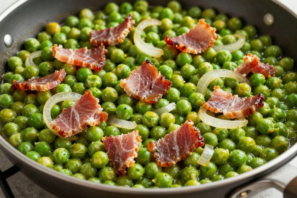 Contorno veloce e gustoso: piselli stufati con cipolla e pancetta pronti in 10 minuti